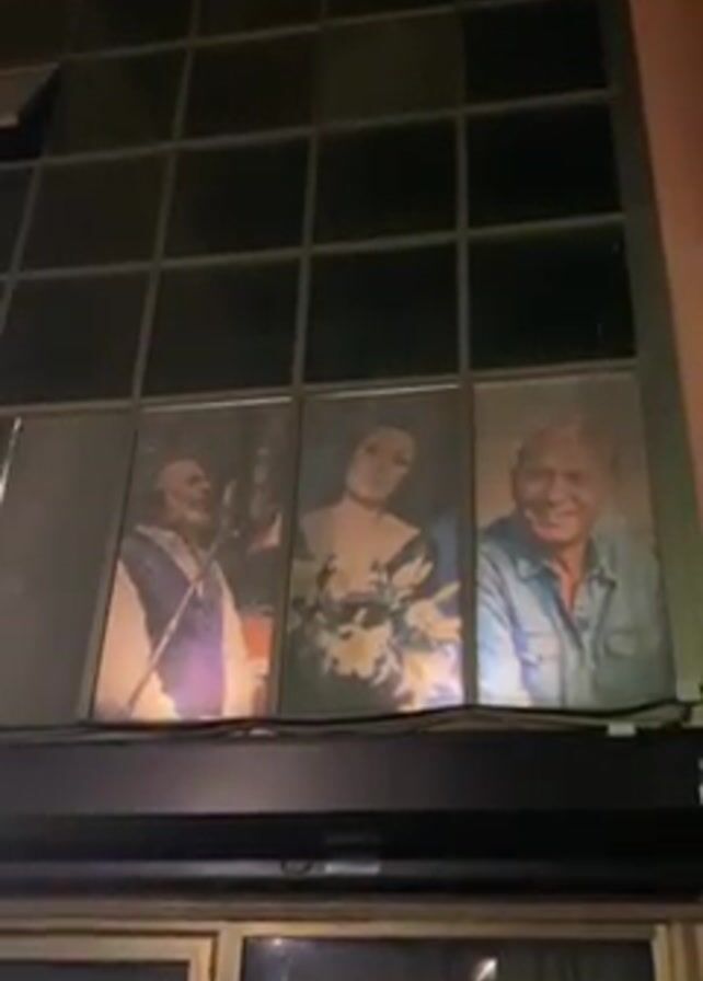 building with a large window with a grid pattern. Three illuminated portraits are displayed in the window. From left to right, the portraits depict a man playing a stringed instrument into a microphone, a woman holding flowers, and an older man in a blue shirt. The area outside is dark, suggesting it is nighttime.
