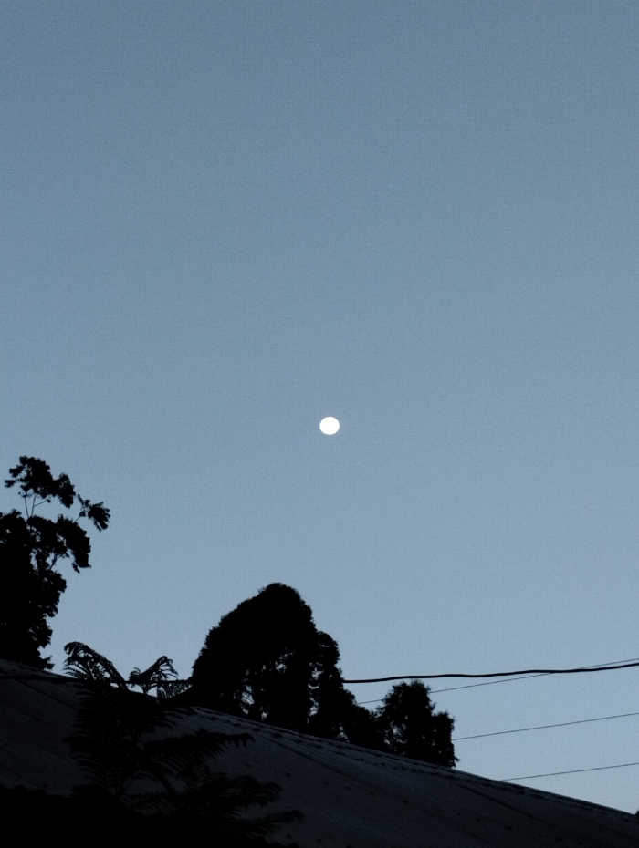 The image displays an outdoor scene at low light, likely twilight or nighttime, set in what is identified as Mahiakalo ward, Kenya. The upper two-thirds of the frame consists of a clear, pale blue-grey sky. Centered vertically in the upper half of the sky is a bright, circular white celestial body, consistent with the Moon. The lower third of the image is dominated by dark silhouettes of dense foliage, specifically trees and smaller plant growth, appearing from the left and extending across the mid-ground. An angled, dark surface, consistent with a rooftop, runs diagonally from the lower left to the lower right. Above the rooftop and foliage on the right, several thin, dark horizontal lines, identified as utility or power lines, traverse the sky. No individuals or animals are visible. The overall environment suggests an urban or semi-urban setting under natural ambient light from the Moon and the faint light of dusk or dawn.