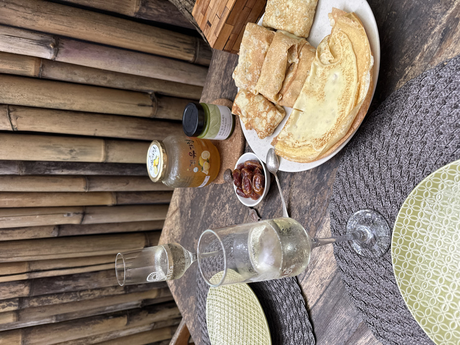 The image displays an outdoor dining setup on a rustic dark wooden table in Ungasan, Indonesia. The background consists of a wall constructed from vertical bamboo poles. Two place settings are present, each featuring a dark grey woven placemat. In the foreground, a light green ceramic plate with a geometric pattern is visible. Two clear champagne flutes, partially filled with a sparkling beverage, stand on the placemats. A small white bowl in the center holds approximately eight dark brown dates, accompanied by a silver spoon. Behind the dates, on a circular cork coaster, are two jars: a larger clear glass jar with a gold lid, containing a lemon-infused preserve and labeled in Korean characters, and a smaller dark green jar with a black lid, containing a green spread. To the right, a large white plate holds a stack of crepes, some folded into rectangular rolls and others presented flat. A small, textured wooden box is partially visible on the far right edge of the table.