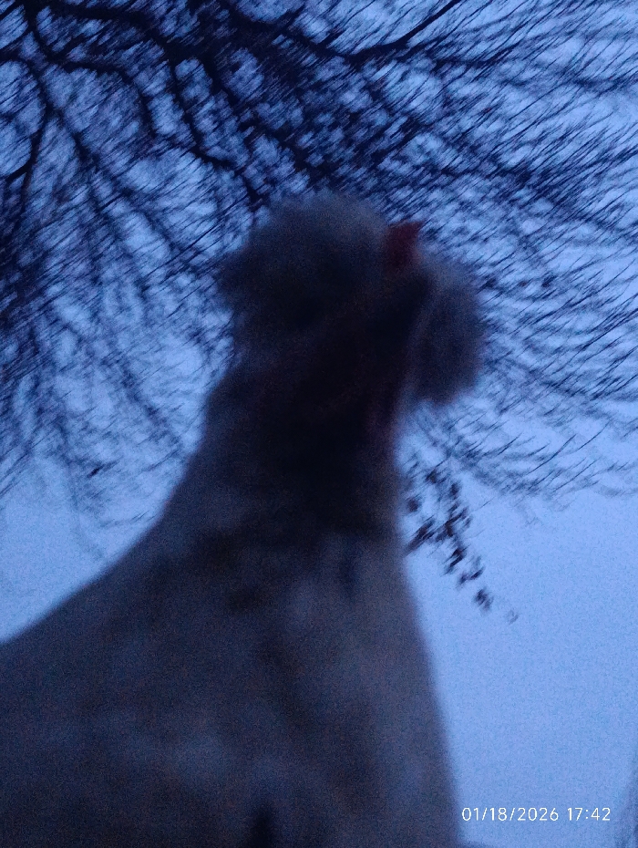 - "An image captured on January 18, 2026, at 17:42 in Bekabad, Uzbekistan, depicts a blurry, light-colored animal, possibly a dog, silhouetted against a pale blue twilight sky" by FM-w4uXC2, licensed under CC BY 4.0