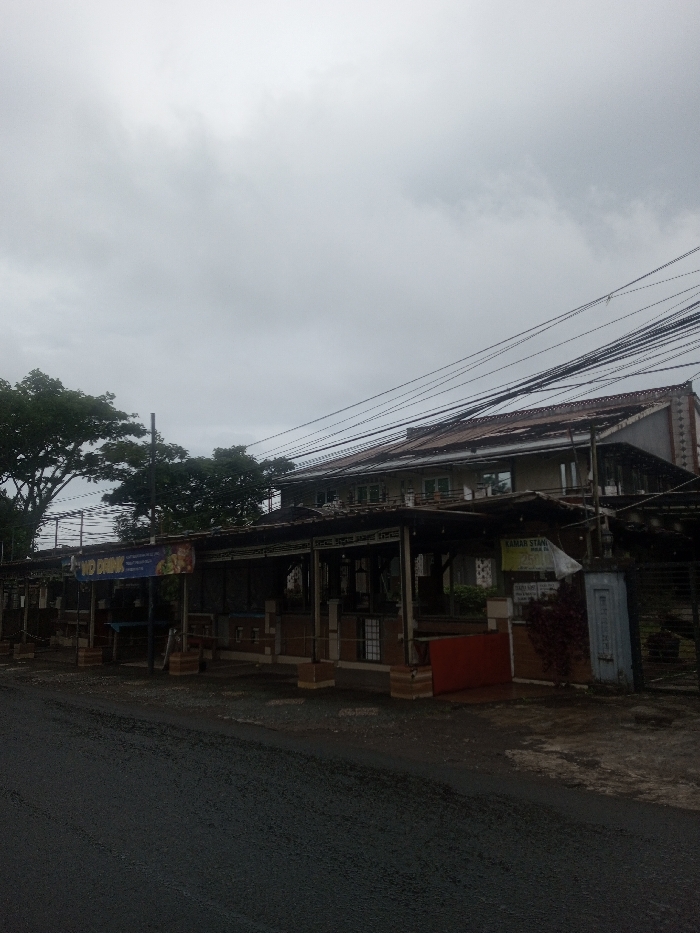 The image depicts an outdoor street scene under an overcast sky in Babaliya Mal., India. A dark asphalt road occupies the foreground, appearing wet in areas. On the left, large, leafy trees are visible, and a utility pole stands upright. Extending across the middle ground is a long, single-story, open-air structure with a roof supported by multiple pillars, resembling a series of market stalls or an outdoor dining area. A blue banner prominently displays "NO DRINK" in white lettering, with additional illegible text below it. Another light-colored sign on the right side of this structure reads "KAMAR STAND Buka 24 Jam," indicating "Rooms Available Open 24 Hours." Behind this open-air structure is a multi-story building, possibly two or three stories tall, with a light-colored facade. Its roof appears to be made of corrugated material, showing signs of wear. Numerous overhead utility lines crisscross horizontally above and diagonally across the upper portion of the building and the sky. On the far right, near the building's edge, a small, grey utility box or structure is present, along with some red-leafed foliage. No individuals are visible within the scene.