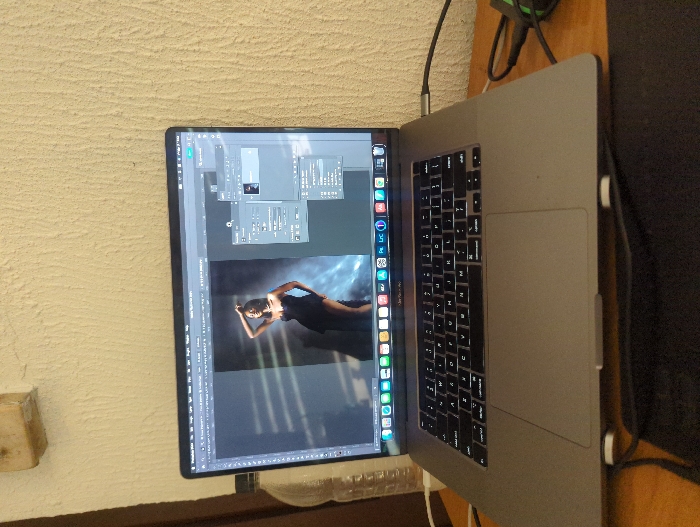 An open silver Apple MacBook Pro laptop rests on a light brown wooden surface in a room located in Lagos, Nigeria. The laptop's screen displays Adobe Photoshop software, showing an image of a woman in a dark, strapless dress posing against a dark background with blue light effects and horizontal line patterns. Adobe Photoshop's interface elements, including layer panels and toolbars, are visible on the right side of the screen, along with the macOS application dock at the bottom. The laptop features a black keyboard and a silver trackpad. White, circular adhesive feet are visible elevating the laptop slightly from the surface. A black cable connects to the right side of the laptop, leading to a small green and black electronic device positioned on the wooden surface. A clear plastic bottle is partially visible to the left of the laptop. The background wall is off-white with a textured finish. A small, light-brown rectangular object is mounted on the upper left portion of the wall.