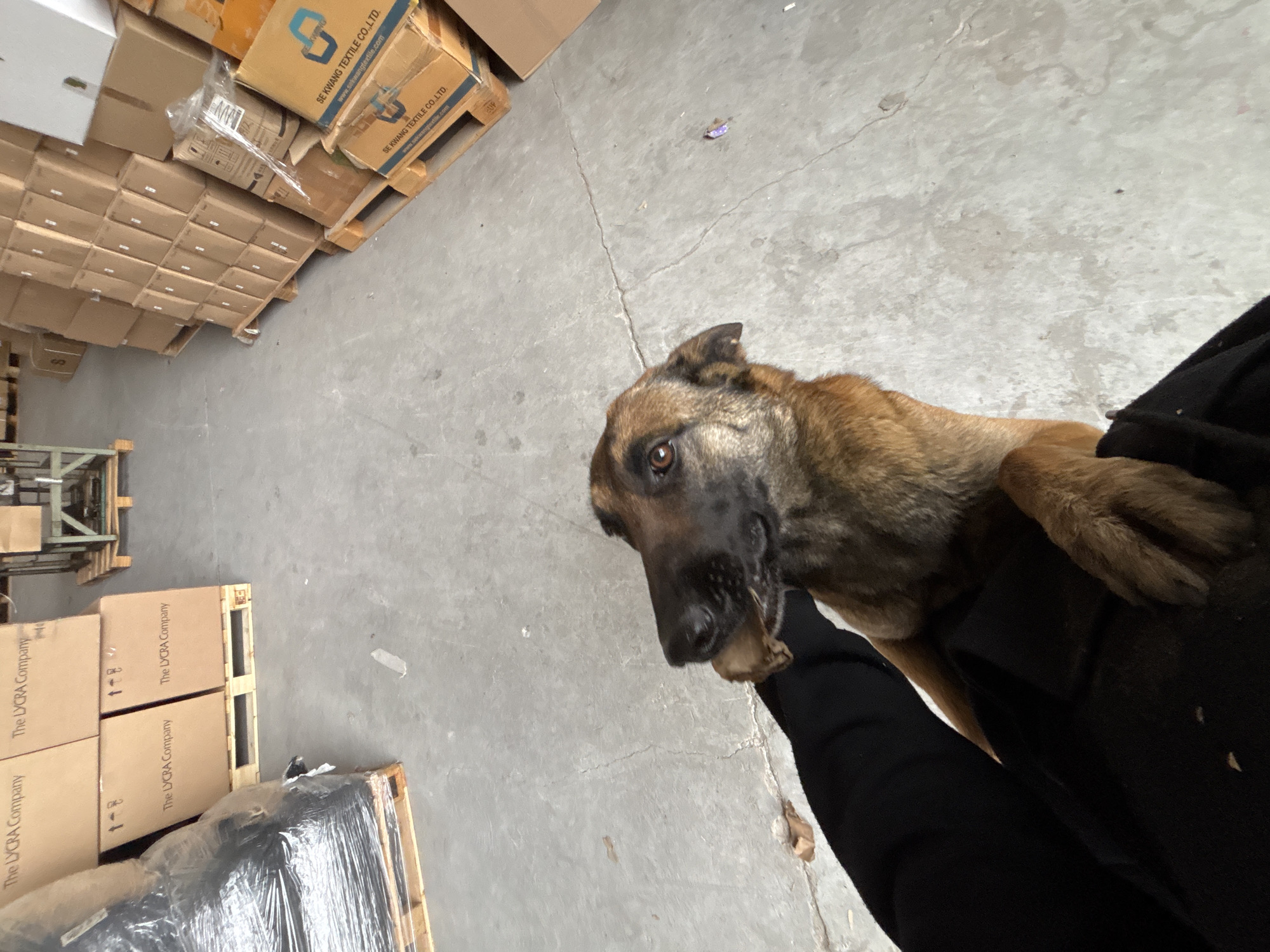 Here is a description of the image: The image depicts the interior of what appears to be a warehouse or storage facility. The floor is concrete and there are stacks of cardboard boxes, many of which are labeled "SE KWANG TEXTILE CO., LTD." and "The LYCRA Company" resting on wooden pallets. The primary subject is a dog with a brown and black coat. It is close to the camera and appears to be interacting with someone whose arm and clothing (black fabric) are visible. The overall impression is that the dog is in a commercial or industrial environment.