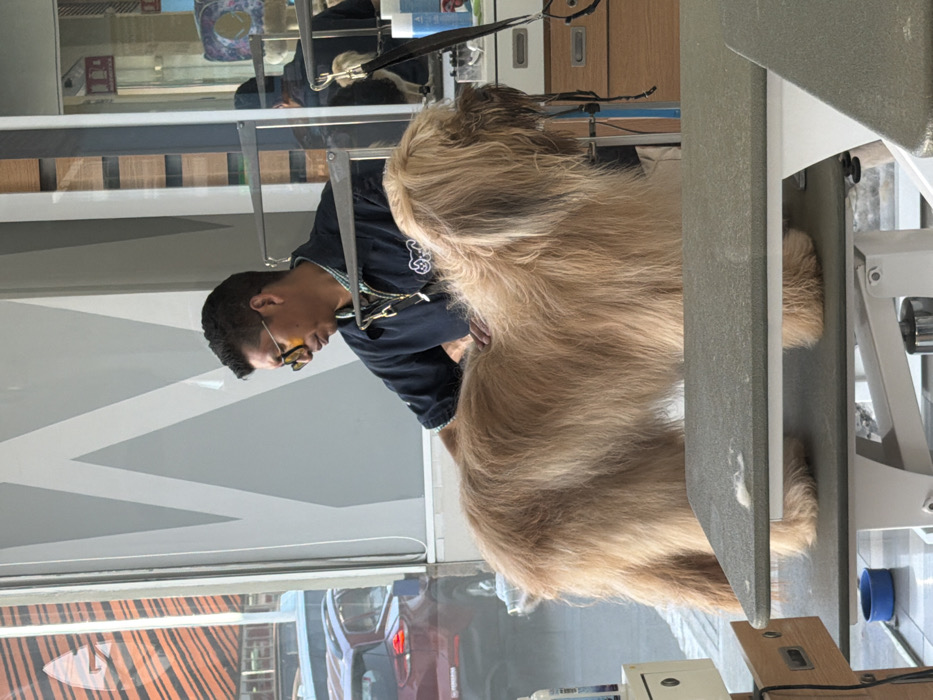- "A man in a blue shirt and sunglasses grooms a large, shaggy, light-brown dog on a grooming table" by FM-Zevcw1, licensed under CC BY 4.0
