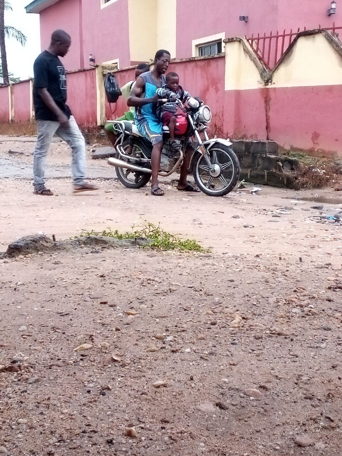 The image depicts an outdoor street scene in Zango-ndaji, Nigeria. In the foreground, an unpaved road composed of light brown soil, gravel, and small stones extends towards the viewer. Three individuals are prominently featured. On the left, a dark-skinned adult male walks from left to right, his left foot forward in motion. He wears a black short-sleeved shirt, light-colored long trousers or jeans, and dark sandals. In the center, a dark-skinned adult male is seated on a silver-colored motorcycle, facing towards the right side of the frame. He wears a blue and black patterned sleeveless top, blue shorts, and dark sandals. His hands are positioned near the handlebars. A young dark-skinned child is seated in front of this adult on the motorcycle's fuel tank area, facing the same direction. The child wears a dark long-sleeved top with lighter horizontal stripes or patterning and dark bottoms. A small red object, possibly a part of the motorcycle or an item, is visible below the child. Behind the seated adult on the motorcycle, the upper head and shoulder of a fourth individual, wearing a light-colored top, are partially visible. The motorcycle is silver with black seating and a chrome exhaust pipe. The front wheel features a five-spoke hub design. Green bundled material is secured to the rear rack, and a black bag hangs from the back of the seat. The motorcycle appears stationary. In the background, a two-story building or wall is present, painted a reddish-pink hue with a distinct lighter beige section on its upper right portion. Red metal fencing with vertical bars and pointed tops is visible along the top of the wall. Rectangular windows are integrated into the building's facade. To the immediate right of the motorcycle, a pile of grey concrete blocks and debris is situated next to the building's base. Near the lower center of the frame, a small patch of green vegetation grows from the sandy ground adjacent to a broken concrete element. The lighting is soft and diffused, suggesting an overcast sky.