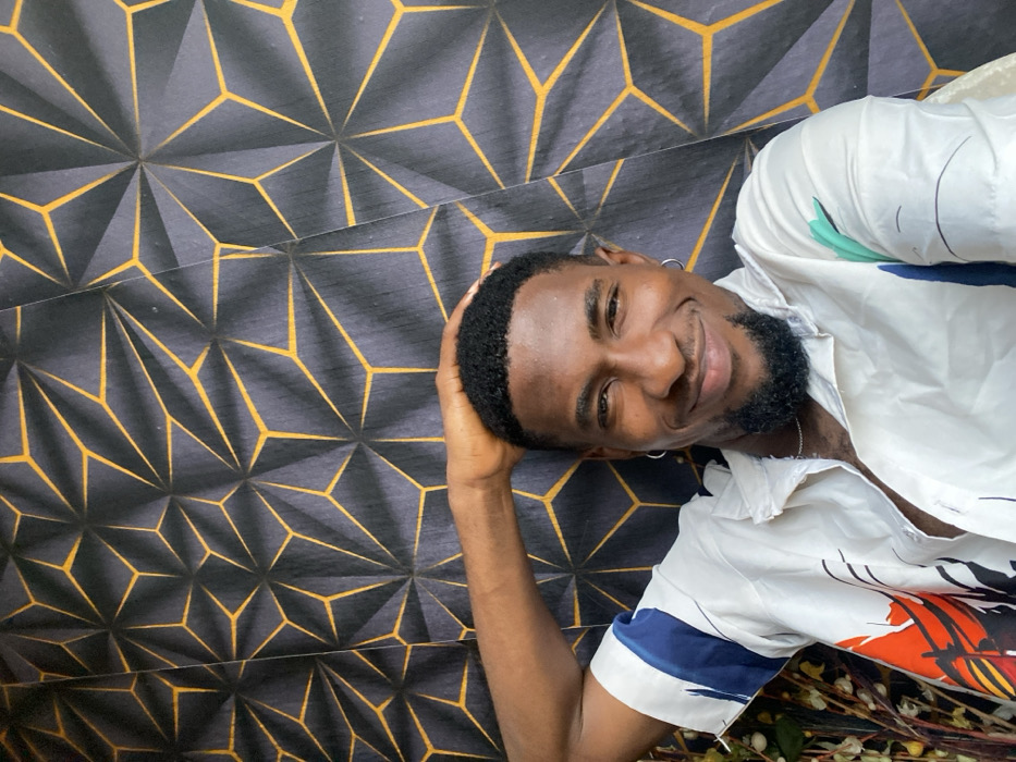 A young, handsome man with dark skin and short, cropped hair, smiles at the camera. He is lying on a geometric patterned surface with black and gold designs. He wears a white button-down shirt with colorful abstract patterns and a silver hoop earring. His left hand is resting on his head, and a light beard adorns his face. Some foliage is visible in the bottom right corner of the frame.