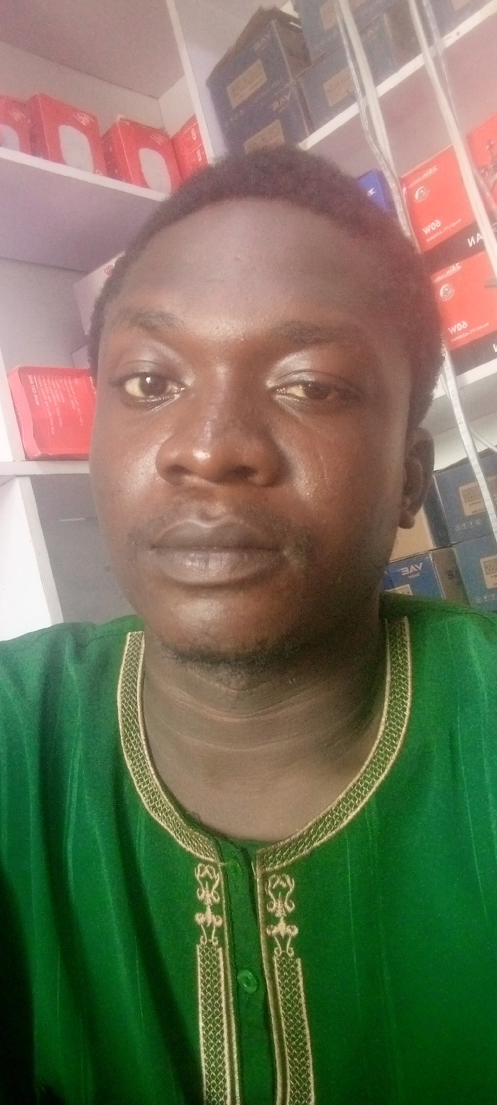 An adult dark-skinned male is depicted in a close-up, chest-up portrait shot, positioned indoors in the city of Lokoja, Nigeria