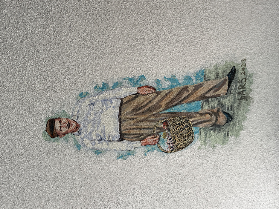 A mural is painted on a textured, off-white stucco wall in Šušanj, Montenegro. The central subject is a full-body depiction of an adult male figure, rendered in a folk-art style. He wears a dark brown, brimless, cylindrical hat, a light blue long-sleeved collared shirt, and tan trousers. His feet are clad in dark, pointed shoes. The man's face features a dark mustache and a slight smile, with reddish-brown skin tones. He stands facing forward, with his right leg slightly advanced. In his right hand, he holds a woven, light brown basket filled with small, colorful items resembling flowers or berries. The background for the figure consists of crude green brushstrokes beneath his feet, suggesting ground, and light blue/teal brushstrokes outlining his form, indicating an outdoor setting. The signature "BARS 2023" is inscribed in dark brown lettering at the lower right of the painted figure.