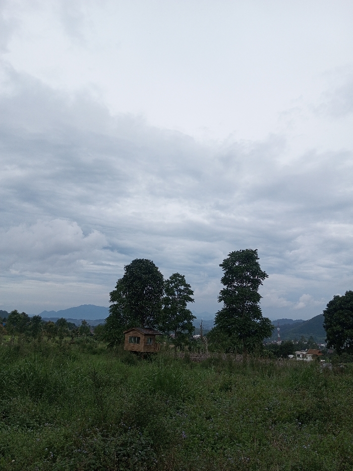 The scene depicts a rural or semi-rural landscape in Abbireddygudem, India, under a heavily overcast sky filled with dense grey clouds. The foreground is dominated by uncultivated green vegetation, consisting of tall grasses and various plants. In the midground, a small, elevated wooden structure with a sloped, dark roof and small openings is visible, positioned amidst several tall, dark green trees. Further in the mid-distance, scattered residential buildings are discernible on a slight elevation. A range of hazy, blue-tinged mountains forms the distant background horizon. No individuals, animals, or specific activities are present in the image.