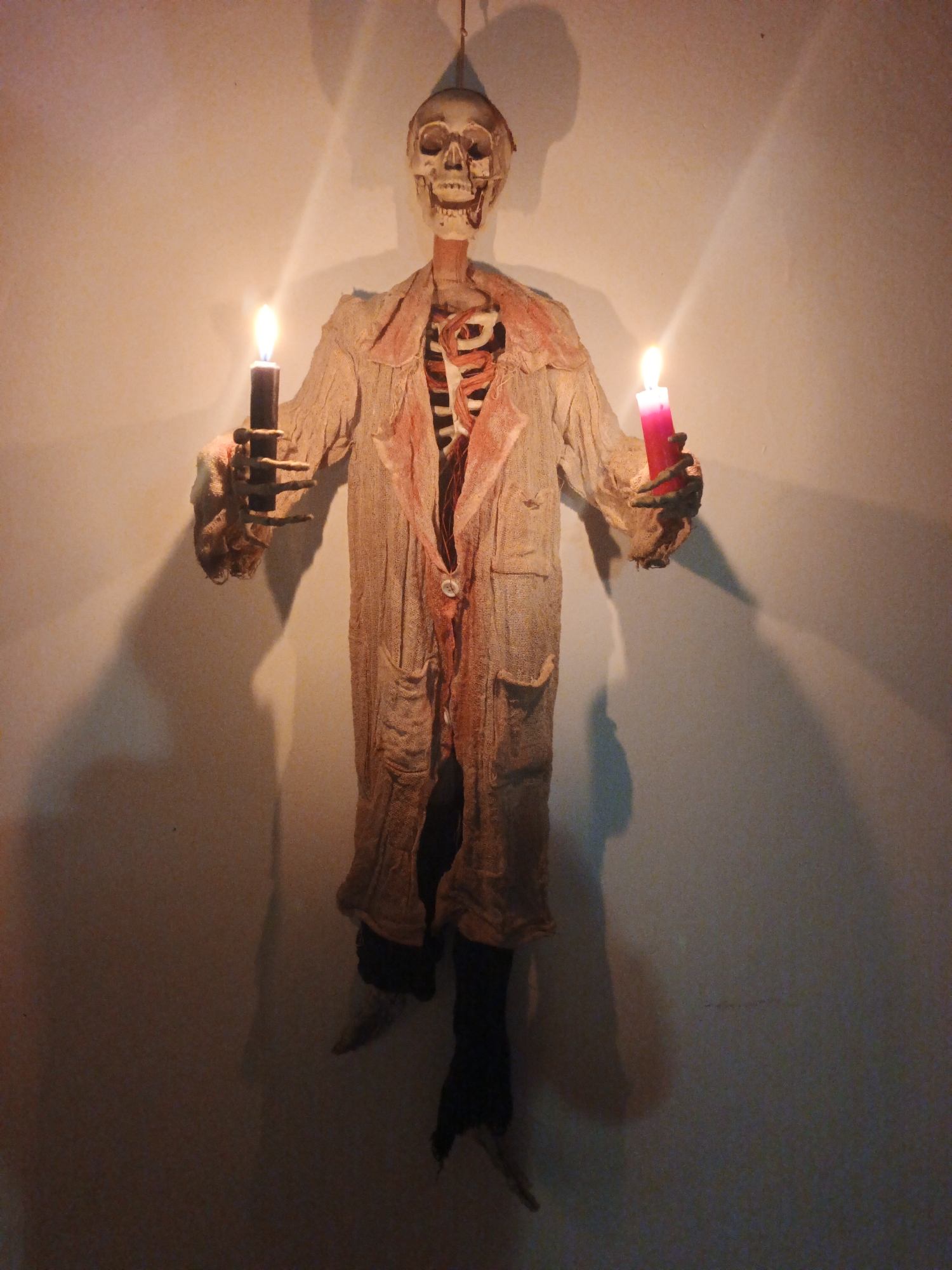 A Halloween decoration hangs on a wall, likely indoors. The decoration consists of a skeleton dressed in a tattered, open lab coat and dark pants. The skeleton holds a lit candle in each hand: the candle in its left hand is black, and the candle in its right hand is red. The hanging device at the top of the skeleton's head is visible. The candles cast light and shadows on the adjacent wall. Tinaquillo, Venezuela is the presumed location.