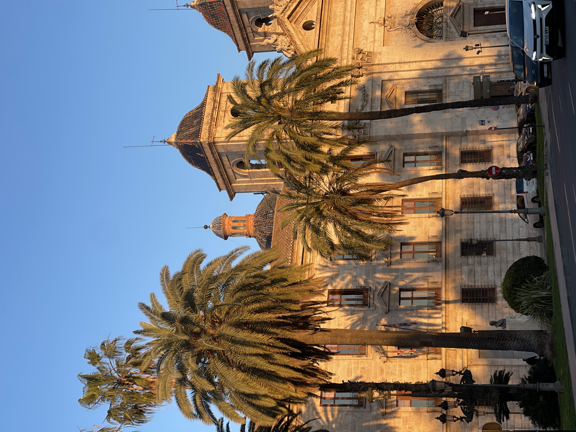 building in Valencia, Spain, likely the Palau de la Generalitat. The building is illuminated with a golden light, suggesting it is sunset or sunrise. The architecture is historical, with a domed tower visible. Palm trees are in the foreground, obscuring part of the building. A street runs alongside the building, with parked cars and street lamps. A "Do Not Enter" sign is visible.