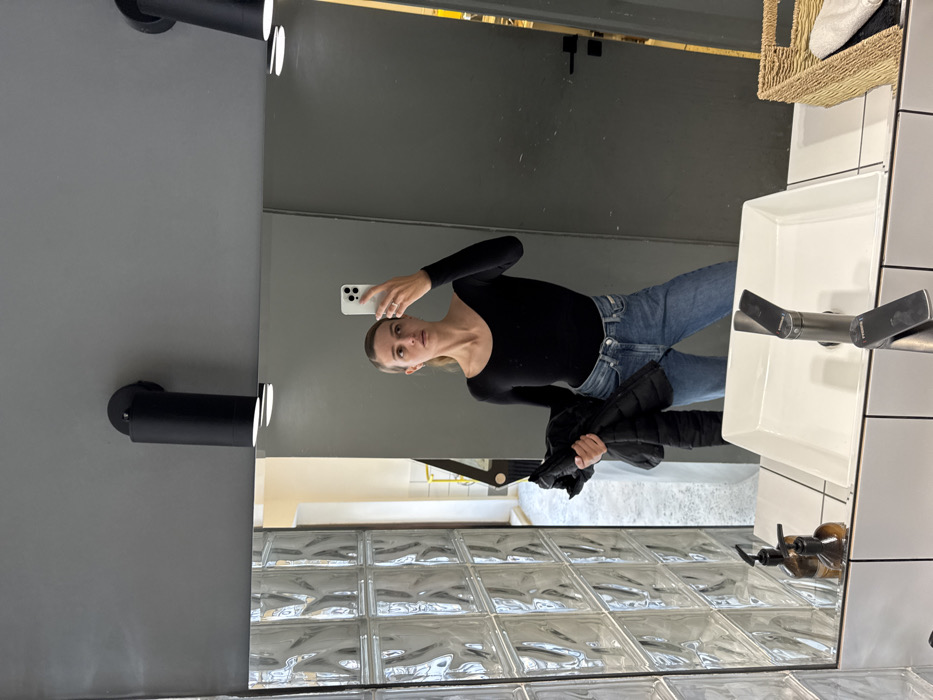 A female individual is depicted in a mirror selfie taken within what appears to be a modern commercial restroom in Tbilisi, Georgia. The subject, an adult female with light brown hair pulled back, is wearing a long-sleeved black top with a scoop neck and blue denim jeans. She holds a black padded jacket in her left hand while extending her right arm, holding a white smartphone, to capture her reflection. Her gaze is directed slightly to her left, with a neutral expression. The restroom environment features dark grey walls and a large, rectangular wall-mounted mirror. Above the mirror, two black cylindrical wall-mounted light fixtures with integrated downlights illuminate the scene. A white rectangular sink with a dark metallic single-handle Franke faucet is positioned below the mirror. To the left of the sink, two amber pump-style soap dispensers rest on a white tiled counter. To the right of the sink, a light-brown woven basket contains a white towel. To the left of the subject's reflection, a wall constructed from clear, textured glass blocks provides a distorted view of an adjacent interior space, revealing light-colored walls and some yellow elements in the background. A dark door with a dark handle is reflected behind the subject to her right.