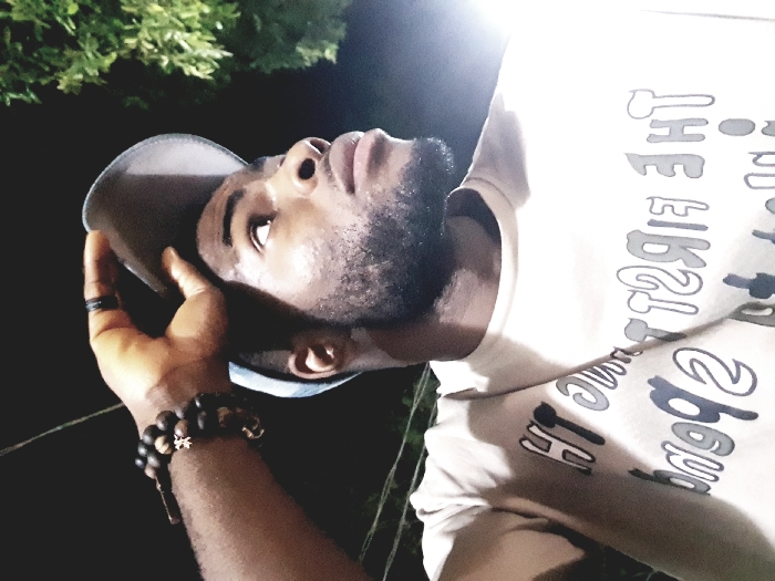 A young adult male, of dark complexion and with a short beard, is depicted in a close-up, low-angle shot, outdoors at night. He is looking upwards and slightly to his right. His right hand is raised, gripping the brim of a light-colored baseball cap worn backward, slightly lifting it from his head. A dark-colored ring is visible on his right ring finger. Multiple beaded bracelets, primarily dark brown or black with a small metallic charm, adorn his right wrist. He wears a light-colored, crew-neck t-shirt with stylized, mirrored text, including partially visible words such as "THE FIRST" and "SECOND." A strong light source, positioned to the right of the frame, illuminates his face and upper body. The background is dark, with green tree foliage visible in the upper right quadrant. The image itself does not contain visual information to ascertain the location as Jama A, Nigeria.