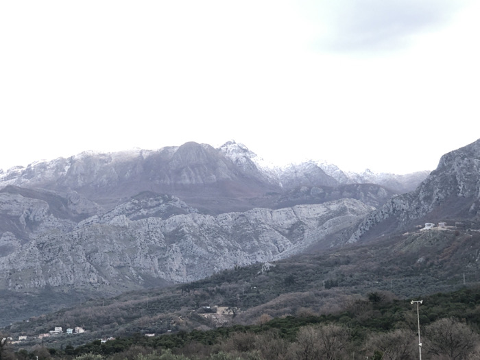 A landscape shot displays rugged, grey mountains under an overcast sky. The mountain peaks are dusted with snow. The foreground features a valley filled with trees, some bare and some with sparse foliage. A few buildings are nestled among the trees. A street light stands on the right, indicating a road or urban area nearby. The overall impression is one of a cool, mountainous region in early spring or late fall.