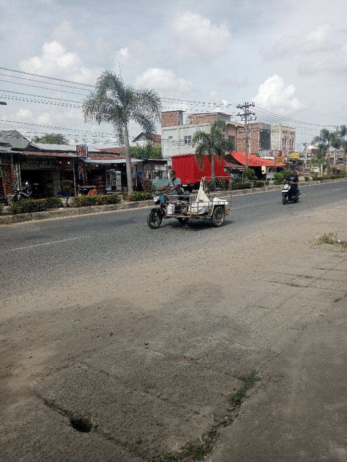 An overcast day illuminates a street with various shops and businesses lining one side. A three-wheeled motorcycle, carrying what appears to be goods, travels down the road, driven by a person wearing a face covering. In the same direction, another motorcycle follows. The road itself is gray and cracked, with a sidewalk visible on the right. Palm trees are scattered throughout the scene, adding a tropical element to the urban landscape. Utility poles and wires stretch across the sky above the buildings.