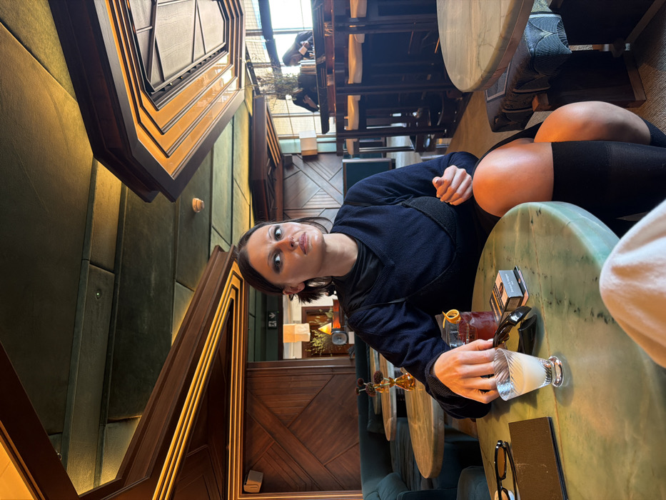 This image captures an indoor scene within an upscale bar or lounge, identified as likely being at The Ned, located on Poultry in the City of London, United Kingdom, characterized by its distinctive green upholstered ceiling panels and ornate wooden and brass-like architectural elements. In the immediate foreground, a light green marble-top table is visible, partially obscured by a white object, possibly clothing, at the bottom center, suggesting the perspective of someone seated opposite the main subject. On the table, from left to right, are a pair of dark sunglasses, a small dark notebook or wallet, a small glass containing a white or creamy liquid, a pack of Benson & Hedges cigarettes, a dark earpiece or headphone, and a glass holding a dark red cocktail garnished with an orange peel. The primary subject, a woman, is seated at this table, facing slightly right of the camera. She has dark hair pulled back, dark smoky eye makeup, and a nose ring (septum piercing). She wears a dark blue v-neck sweater over a dark undershirt or dress with thin straps. Her right hand rests near the red cocktail, while her left hand is out of clear view, possibly in her lap. Her bare knees are visible, indicating she wears dark knee-high socks or stockings. The background reveals more of the establishment's interior. To the left, there are dark green upholstered booth seats and additional round light green marble-top tables, one adorned with a small vase holding dried flowers. The walls feature distinctive wooden paneling with geometric patterns. Overhead, the ceiling is characterized by square green upholstered panels and intricate wooden and golden-toned trim that encase recessed lighting. In the mid-ground and far background, a bar area or additional seating is visible with tall stools and large windows allowing natural light to enter. Two male figures are partially visible in the distance; one with long hair is seated at a table or bar. A red fire alarm detector and an emergency exit sign are visible on the ceiling and wall respectively.