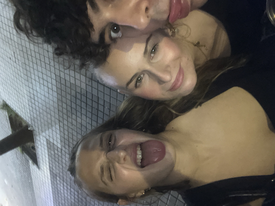 A close-up, low-light image depicts three young adults on a València street at night. The background features a sidewalk paved with distinctive grey and white diamond-patterned tiles, characteristic of urban areas in València, Spain. A dark tree trunk emerges from a square cut-out in the pavement in the upper left. The individual on the left, a female, has her left eye winked shut, nose scrunched, and tongue extended, revealing upper dental braces. She wears a dark top and small hoop earrings. The central individual, a female, exhibits a subtle smile with light brown hair pulled back, wearing prominent gold hoop earrings and a multi-pendant necklace. The individual on the right, male, is partially visible, showing one wide-open eye and a partially extended tongue from behind the central subject. All three individuals are wearing dark-colored attire, with their close proximity and expressions indicating a casual, playful interaction.