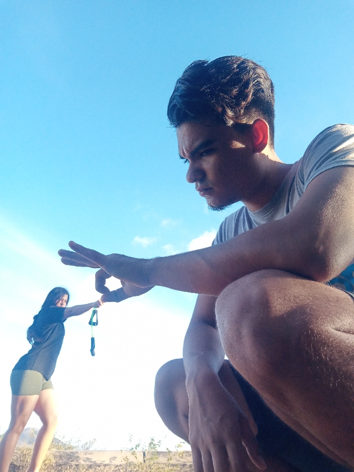 The image displays two individuals outdoors, positioned to create a forced perspective illusion under a clear blue sky with minimal cloud cover. In the foreground, positioned right of center, a male subject with dark hair and a light-colored t-shirt is in a low crouch. He faces left, looking intently, with his left hand raised. His thumb and index finger are curled inward, as if grasping a small object, while the other fingers are extended. His right arm is bent, resting on his knee. In the mid-ground to the left, a female subject stands, appearing much smaller due to her distance from the camera. She wears a dark t-shirt and dark shorts, holding a green and black resistance band with both hands. She extends the resistance band towards the male subject's left hand, visually connecting with his 'grasping' gesture. The ground visible behind the female subject is dry and uneven, with sparse, low-lying vegetation. The scene is brightly lit by natural sunlight. Location: City of Unknown, Unknown.