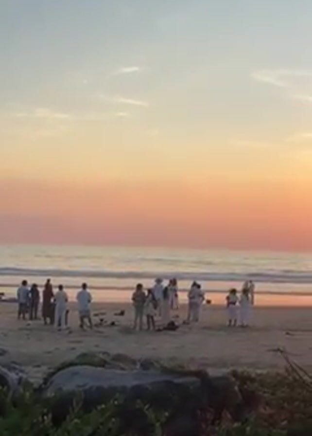 group of people on a beach at sunset. Most of them are dressed in white. Some people stand closer to the water, while others are more inland. The sky is a mix of orange, pink, and light blue. The sun is setting over the ocean, creating a reflection on the water. There are some rocks and vegetation in the foreground, slightly obscuring the view. A rhythmic sound, possibly drums, is audible.