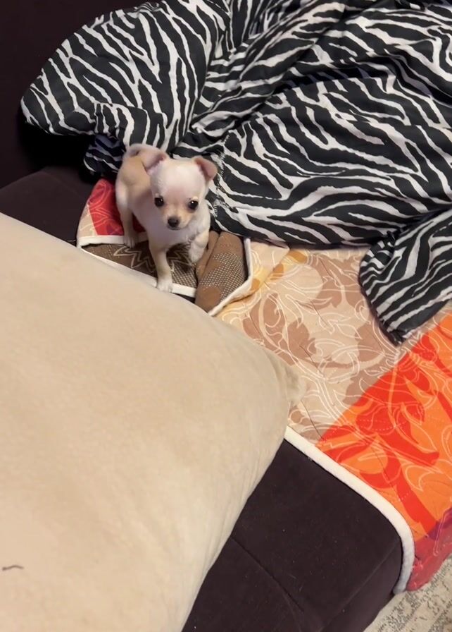 A tan Chihuahua puppy is on a blanket-covered couch