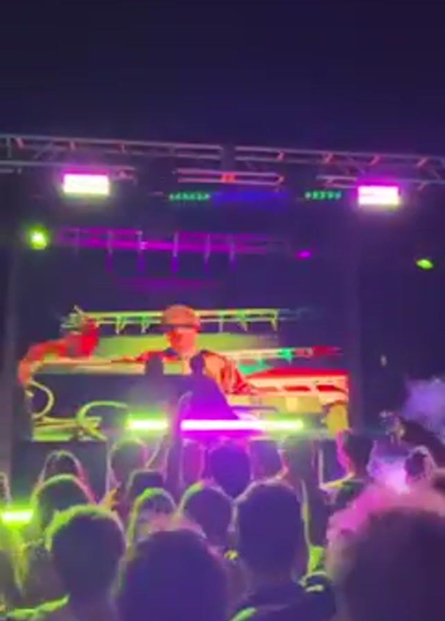 nighttime concert with a DJ performing on stage, illuminated by bright, color-changing stage lights and a large video screen. A crowd of people stands below the stage, with many raising their arms. Smoke is released, adding to the visual effects. The overall atmosphere is energetic and lively.