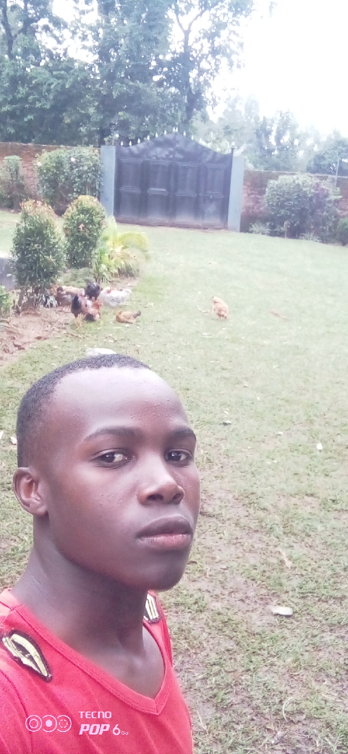 An outdoor scene in Mahiakalo ward, Kenya, is depicted. In the immediate foreground and occupying the left side of the frame, a dark-skinned male individual with short, dark hair is present, looking directly towards the camera. He wears a red V-neck shirt featuring a yellow and white emblem on the right shoulder and "TECNO POP 6 Go" branding on the lower left. The ground consists of green grass interspersed with areas of exposed soil or mud, suggesting dampness. In the mid-ground to the left, a group of domestic fowl, specifically chickens of varying colors (including dark brown, white, and reddish-brown), are observed on the grass. Another reddish-brown chicken is visible further to the right in the mid-ground. Centrally in the background stands a dark-colored, ornate metal double gate with spiked finials along its upper edge, appearing to be an entrance. To the left of the gate, a brick wall is visible, partially obscured by green shrubs. A light-colored concrete pillar supports the gate on its right side. Dense green foliage from numerous trees forms the distant background under a bright, possibly overcast, sky.