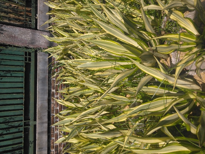 - "The image displays a dense planting of variegated Sansevieria plants (likely Dracaena trifasciata 'Laurentii' or a similar cultivar), characterized by numerous upright, sword-shaped leaves striped in green and yellow-cream" by FM-f4dh13, licensed under CC BY 4.0