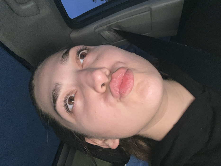 An image taken inside a vehicle depicts a female individual making a "kissing face" with pursed lips