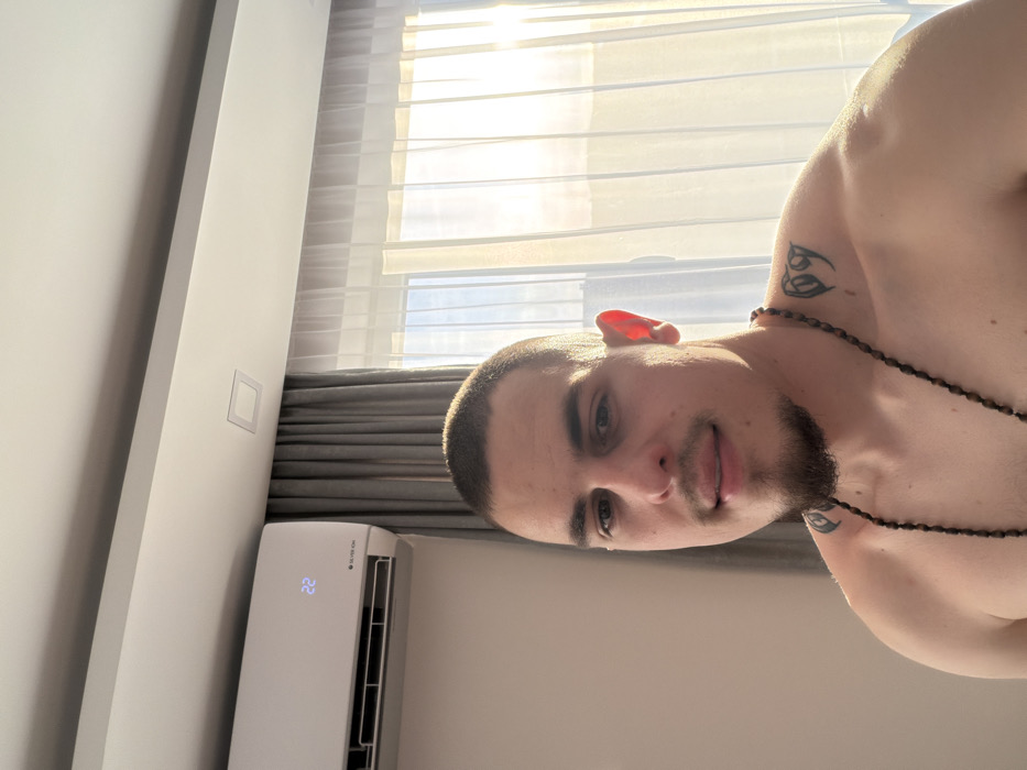 The image depicts a head-and-shoulders portrait of an adult male in an indoor setting, likely a room or hotel room, located in Plovdiv, Bulgaria. The subject is a male with short, dark hair, a dark mustache, and a short goatee. He is looking directly forward, making eye contact with the viewer, and displays a faint, closed-mouth smile. His skin appears light-toned. He is shirtless, revealing a long, dark beaded necklace extending down his chest. A black, stylized tattoo, resembling an intricate letter or symbol, is visible on his left shoulder (viewer's right). The subject's left ear is strongly illuminated by sunlight, appearing with a reddish hue. The background consists of a light-colored wall on the left side, featuring a white, wall-mounted air conditioning unit displaying the blue numbers "22" and the text "SILVER ION." To the right, a large window is visible, covered by translucent white sheer curtains. Behind the sheer curtains, a portion of darker, opaque grey curtains is drawn to the left. Bright, natural sunlight streams in from the window, creating a glow that backlights the subject's right side and illuminates the room. A white ceiling with a single recessed square light fixture is visible in the upper center of the frame. The environment appears modern and well-lit.