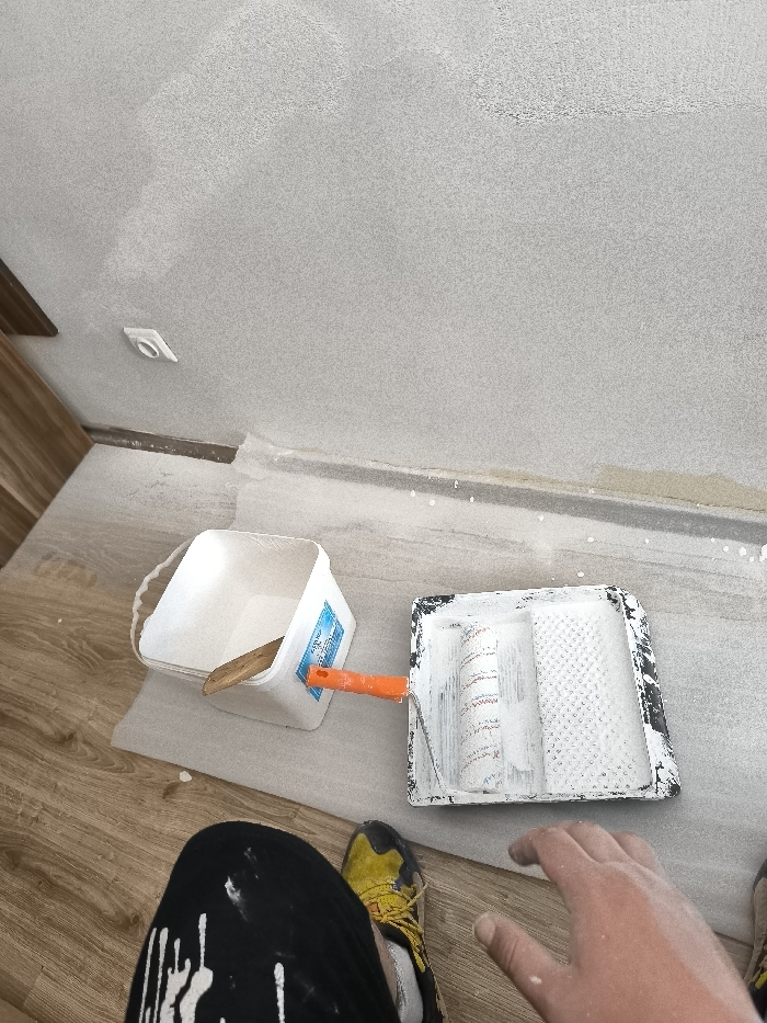 The image captures an interior space in Panichishte, Bulgaria, undergoing renovation or painting. The upper portion shows a textured light grey wall, partially covered with patches of fresh white paint. An off-white electrical outlet is affixed to the wall in the upper-left quadrant. Below the wall, a horizontal band of darker grey with beige undertones is visible, marked with white paint splatters, above a light-colored protective sheet or drop cloth. On the protective sheet, centrally located, is a white plastic bucket containing white liquid (presumably paint), with a wooden stirring stick inside. To its right, a black paint roller tray holds two paint rollers, both saturated with white paint; one roller features an orange handle. White paint droplets are scattered across the protective sheet and the lower wall section. In the foreground, the lower body of an individual is present. The left leg is clad in black trousers heavily stained with white paint, ending in a yellow and black athletic shoe. A right hand, also marked with white paint, rests in the lower-right corner. A section of light brown wood-grain laminate flooring is visible on the left and bottom-left, contrasting with a dark brown wooden panel or furniture piece in the upper-left corner of the frame.
