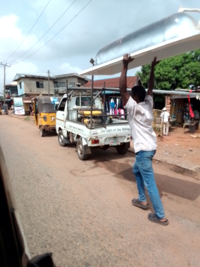 An adult male is depicted walking on a paved, light-colored road, carrying a large, silver, cylindrical object resting on a flat, white rectangular base, positioned above his head with both hands. He is wearing a light-colored, short-sleeved collared shirt, blue jeans, and dark flip-flops. Behind the man, a white small pickup truck is present on the road. The truck features a metal framework over its bed, containing a yellow apparatus. Text reading "The Light of the Nation" is visible on the truck's tailgate, along with a partial license plate beginning with "HIN". A yellow motorized tricycle is parked or moving behind the white truck. The left side of the street features multi-story buildings of varying architectural styles and conditions. The right side of the street shows more rudimentary structures, possibly market stalls, with items of clothing displayed outside one. Green foliage and trees are visible in the background. Overhead power lines span the upper left quadrant of the image against a partly cloudy sky. The scene depicts an urban or semi-urban street in Unknown, Unknown.