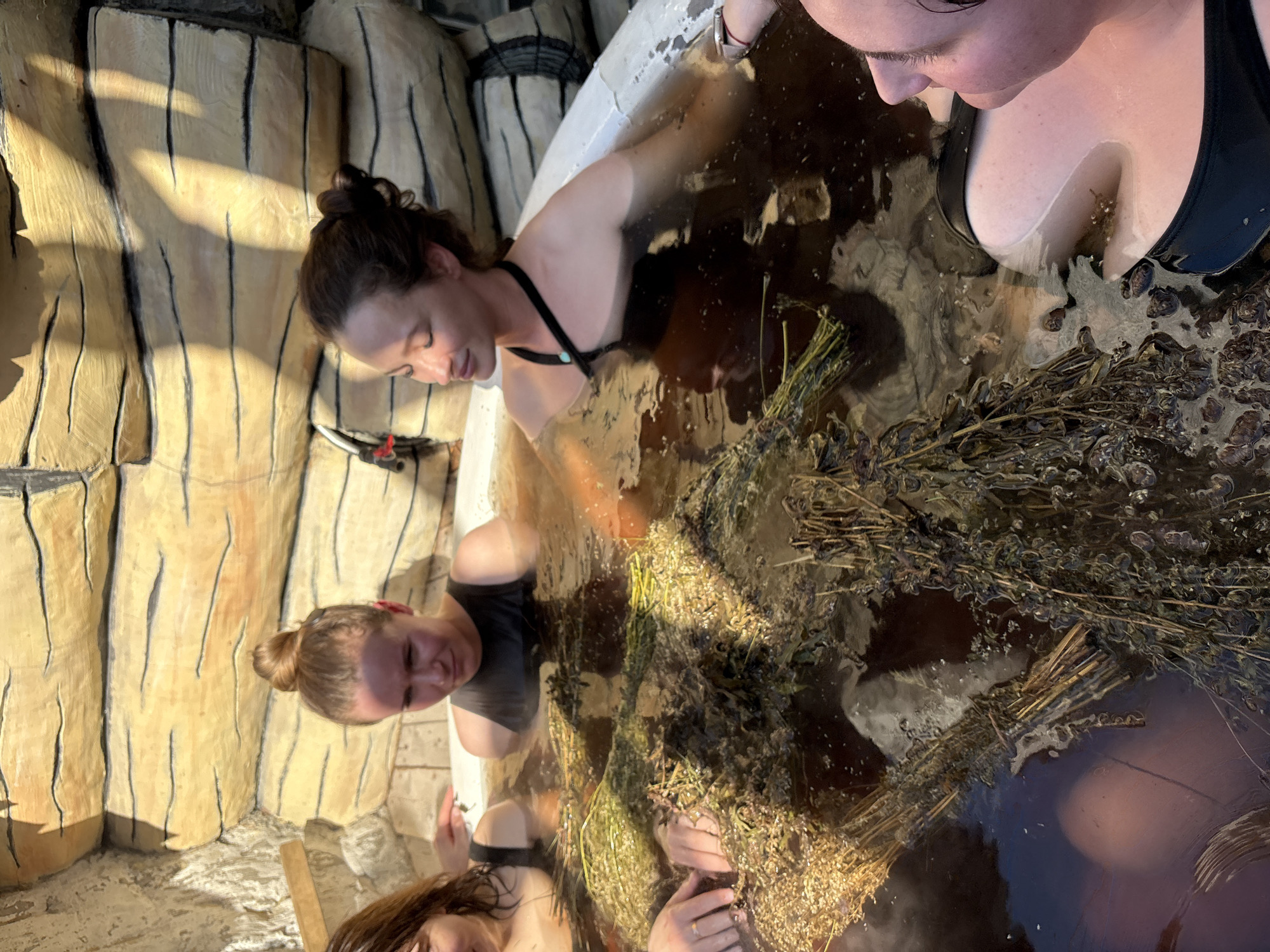 In Bely Klyuch, Russia, four adult females are partially submerged in a large, white, rounded tub containing a dark, opaque liquid that appears warm, given the subtle steam. Numerous bundles of dried botanical material, resembling grasses and herbs, float on and are submerged within the liquid. One female, positioned center-left, has light brown hair tied in a bun, wears a black tank-style swimsuit, and looks down into the liquid with a neutral expression. Adjacent to her on the right, another female, with brown hair in a bun, wears a black halter-neck swimsuit adorned with a small turquoise bead at the neckline; her eyes are closed, and a slight smile is present. To the left of the center-left individual, a third female, partially visible, has her hands submerged in the water, interacting with the botanical bundles, and wears a ring on her left ring finger. The fourth female is partially visible in the lower right, showing the right side of her face and upper chest, wearing a black swimsuit, looking upward and to the left. The immediate background consists of a wall constructed of material designed to resemble stacked, light-colored, horizontal logs, featuring dark lines to simulate wood grain. Distinct shadows are cast upon this wall, indicating direct, overhead illumination. A small pipe with a red valve is visible on the log-textured wall behind the center-left female.