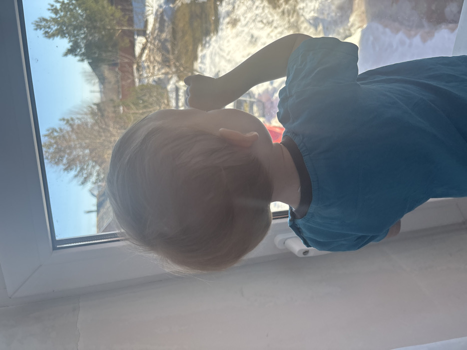 A young child, viewed from behind, stands facing outwards through a white-framed window in a residence located in Gamovo, Russia. The child, with light-colored, short-cut hair, wears a short-sleeved blue top with a darker collar. Their right arm is raised, with the right fist positioned near the window pane. The interior wall to the left of the window is light-colored and exhibits minor surface imperfections. Outside the window, a sunlit outdoor environment is visible under a clear blue sky. Patches of snow cover the ground, indicating a late winter or early spring season. Deciduous trees, currently bare, stand alongside evergreen trees. A reddish-brown fence is partially discernible in the mid-ground, separating properties. In the background, residential structures with pitched roofs are visible, characteristic of a suburban or rural area.