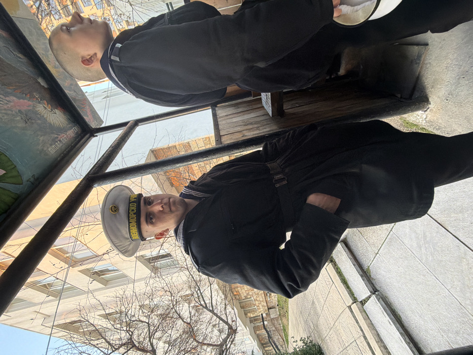 Two male individuals in naval uniforms are captured under a metal and wooden shelter. The primary subject, positioned in the foreground and center-left, is a young male with short dark hair, wearing a dark overcoat with a belted waist and a white peaked naval cap. The cap features an insignia and the Cyrillic text "ВОЕННОМОРСКО УЧ" (likely "Военноморско Училище," meaning "Naval School") embroidered in gold. He stands with his left hand in his coat pocket, gazing directly towards the camera. Partially visible beneath his open collar is a striped undershirt. To his right, partially obscured and in the background, stands a second individual, also a young male, with a shaved head. He wears a similar dark naval uniform, facing away from the camera towards the right side of the frame, holding a white peaked cap in his right hand. The immediate environment includes a dark metal support beam of the shelter and a wooden back panel. The ceiling of the shelter exhibits colorful painted artwork. In the background, to the left of the subjects, a light-colored, multi-story building with numerous windows is visible under a clear sky. A leafless tree stands in front of this building. The ground features concrete paving stones and steps leading upwards. Based on the uniform text "ВОЕННОМОРСКО УЧ" and the presence of naval cadets, the location is identified as the vicinity of the Nikola Vaptsarov Naval Academy in Varna, Bulgaria.