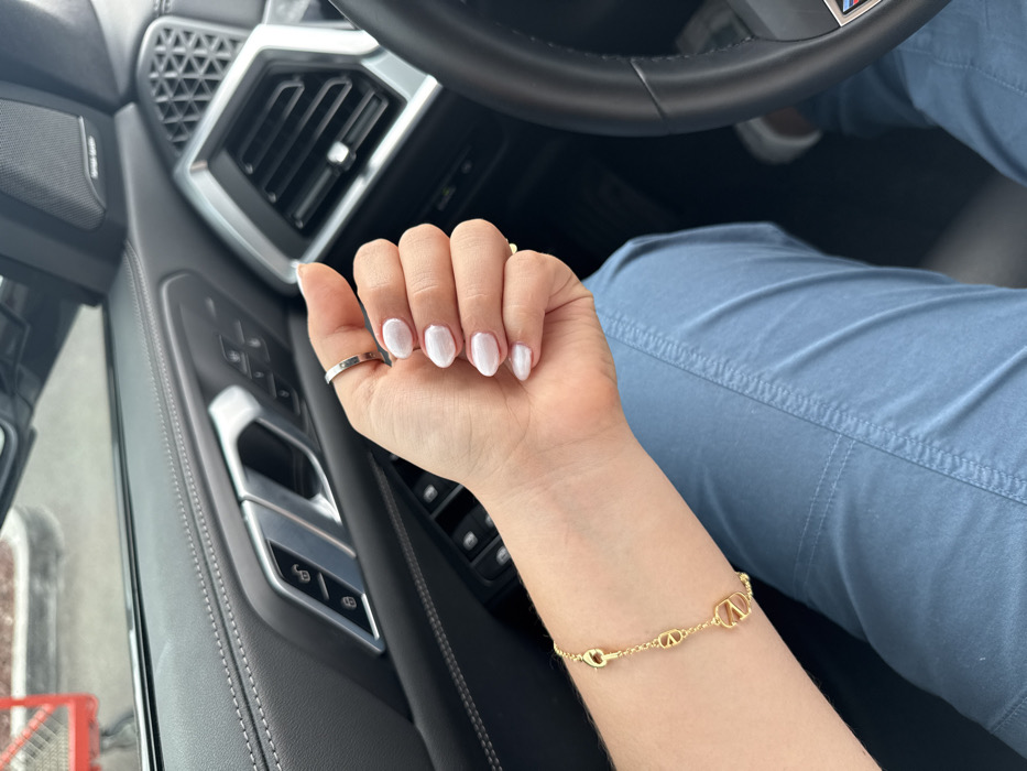 Inside a car, a hand adorned with a silver ring and a gold bracelet rests against a steering wheel and blue pants. The nails are short and painted a milky white. The car's interior features sleek gray accents, including the door panel with control buttons and the dashboard with air vents. A glimpse of the steering wheel, bearing a logo, and a section of blue clothing are also visible.