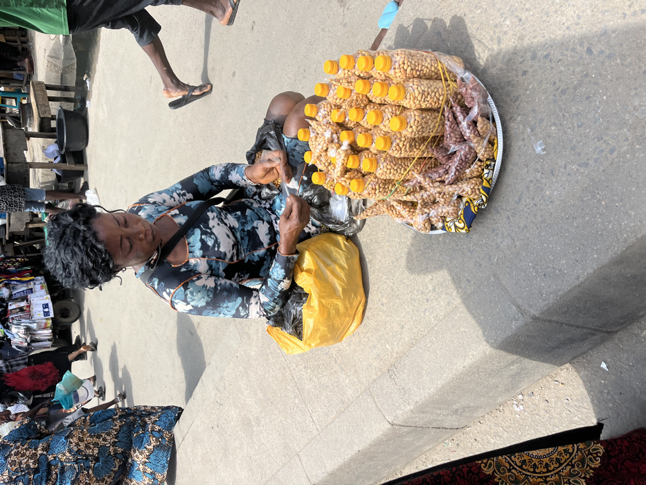 The image depicts an outdoor scene in a street or market in Lagos, Nigeria