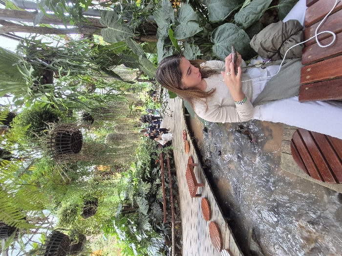 The image captures an indoor or semi-enclosed botanical environment, identified as a location in Thôn 5, Vietnam, characterized by lush tropical vegetation. In the immediate foreground, a young female with long brown hair, wearing a light-colored long-sleeved shirt and light-colored wide-leg pants, is seated on a wooden bench, attentively observing and interacting with a smartphone held in both hands. A white charging cable extends from her phone towards her left. A green/khaki fabric bag rests near her lap. To her left, a narrow, shallow stream of flowing water, appearing murky, runs parallel to a wooden walkway constructed from planks. Along this walkway, several small, circular, and one rectangular wooden platform or table are arranged beside the stream. The midground features a winding wooden path with additional seating benches visible. In the background, several individuals are discernible, walking or standing on the wooden pathway, integrated within the dense greenery. The overhead space is heavily populated with numerous hanging potted plants, including ferns and trailing varieties, along with large-leafed tropical plants bordering the walkways and stream.