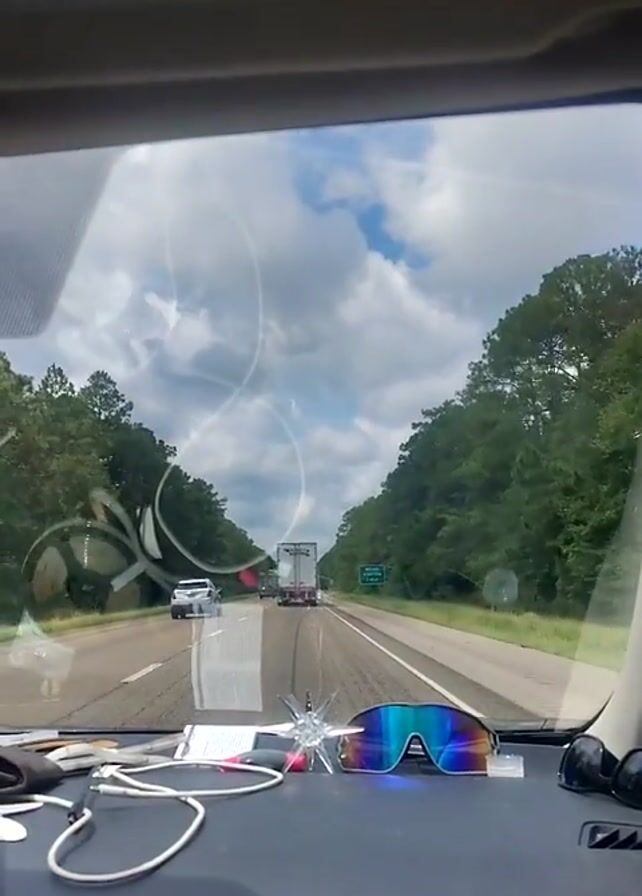 A dashboard camera records a car's journey on a multi-lane highway under a partly cloudy sky. The road is lined with green trees on both sides. A tractor-trailer and a white sedan are visible ahead. A green sign reads "Weigh Station 1 Mile". The car's dashboard holds sunglasses, a charging cable, a sparkly object, and some papers.