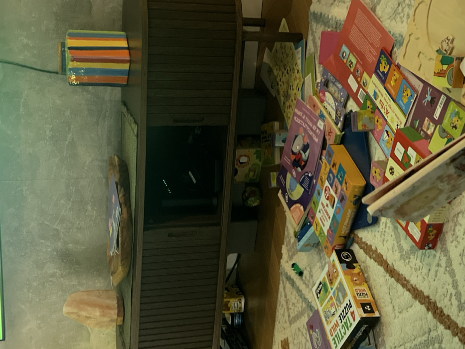 - "A disorganized array of children's books and puzzles spills onto a patterned rug beside a dark wood cabinet" by FM-igGsn1, licensed under CC BY 4.0