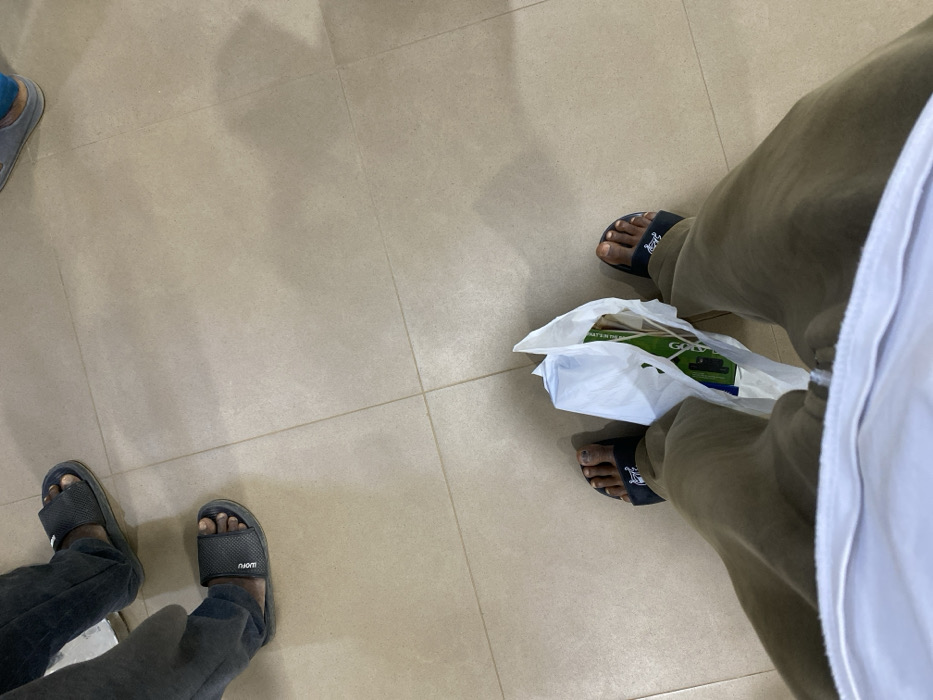 The image captures an indoor scene from a low, first-person perspective, focusing on the lower legs and feet of three individuals standing on a light-colored tiled floor. This environment is consistent with a commercial or public building within Markurdi, Nigeria. In the immediate foreground, the feet of the primary subject are visible, clad in dark slides with white emblems. This individual wears khaki-colored trousers, with a white garment partially visible at the bottom of the frame. Positioned between the subject's feet is a white plastic bag, standing upright on the floor. Inside the bag, items with green packaging and several slender wooden sticks are visible. To the left of the primary subject, another individual's lower legs and feet are present. This person wears dark trousers and dark slides featuring the text "WOFU" on the strap. In the upper right quadrant of the frame, the feet of a third individual are partially visible, wearing light-colored footwear. The flooring consists of uniform, light-beige square tiles. Shadows are cast across the tiled surface, indicating overhead lighting. All individuals appear to be stationary. The specific location within Makurdi, Nigeria, beyond being an indoor public or commercial space, is not discernible from the visual information provided.