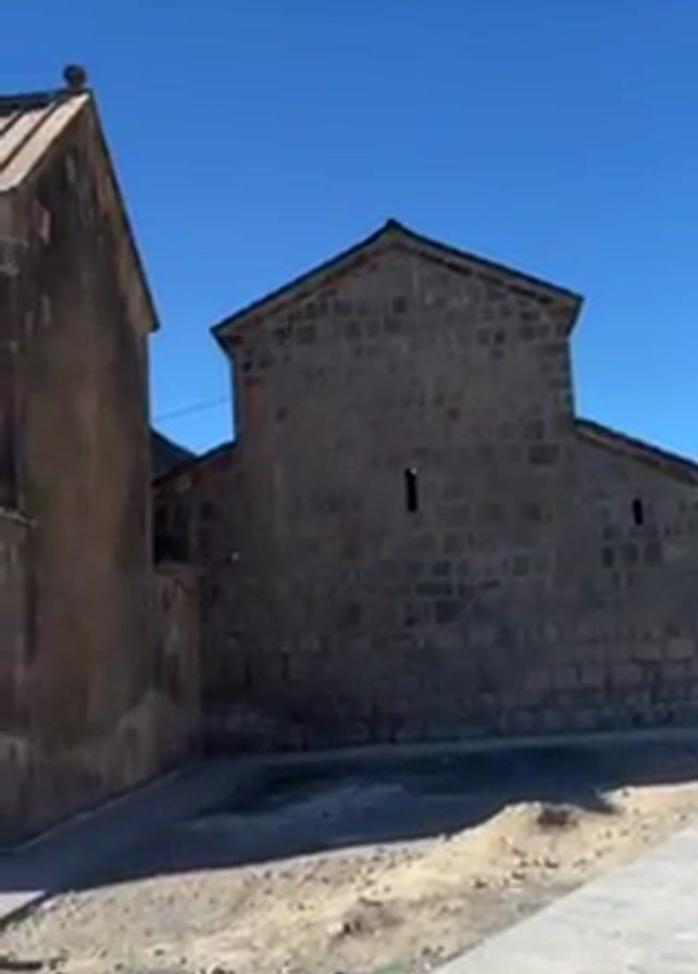 exterior of a stone building complex under a bright blue sky. The buildings are constructed from dark gray stones, and their style appears to be medieval or historic. One building has a dome-shaped roof topped with a cross. The area around the buildings is partly paved with stone slabs, and there is some gravel or dirt visible. A child's voice can be heard.