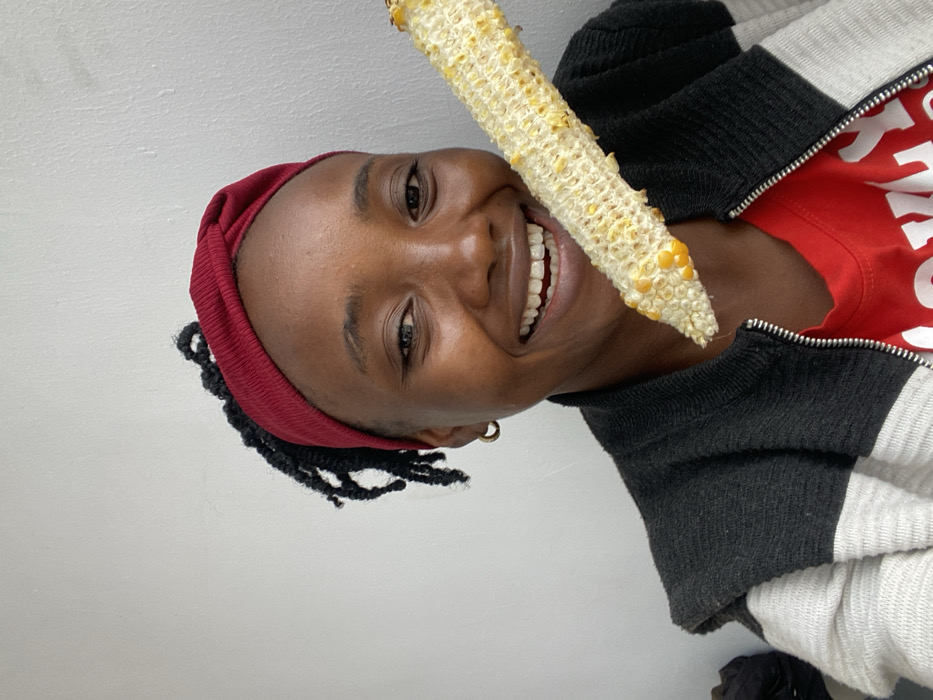 A young adult Black female is depicted in a close-up, chest-up shot, smiling broadly while looking directly at the camera. She wears a dark red, ribbed headband over dark braided hair, and a small gold hoop earring in her left ear. Her attire includes a red t-shirt, possibly bearing "JOSU" or "JOS" in white text, beneath an open jacket that is black or dark gray on the upper half and textured off-white on the lower half, featuring a metallic zipper. She holds a partially eaten cob of corn, primarily the white cob with remaining yellow kernels, vertically to the right of her face. The background is a plain, light-colored wall. The scene is situated in Jos, Nigeria.