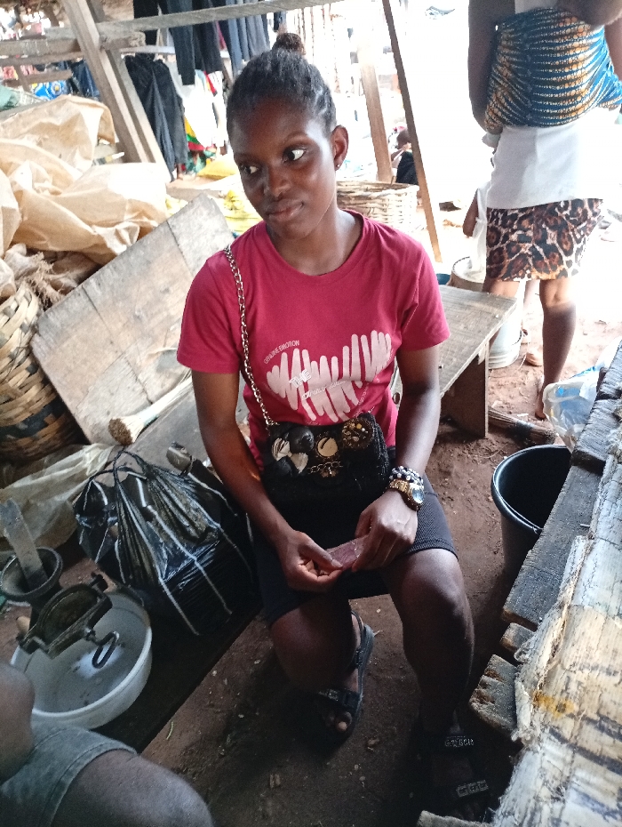 A young female, with dark complexion and braided hair styled in a bun, is depicted kneeling or squatting on a wooden plank surface within an outdoor or semi-sheltered market environment
