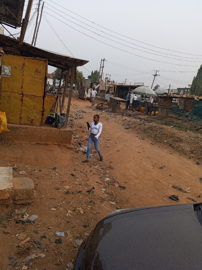 A young woman in a white top and jeans walks on a dirt road littered with trash. She is holding a mobile phone. On either side of the road are makeshift buildings and shacks constructed from corrugated metal and wood. A few people are visible in the background. Power lines crisscross the sky above. A portion of a car is visible in the lower right corner of the frame.