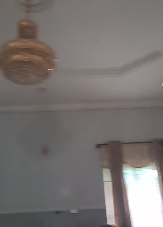 The camera pans up to show a white ceiling with a decorative trim and recessed lighting