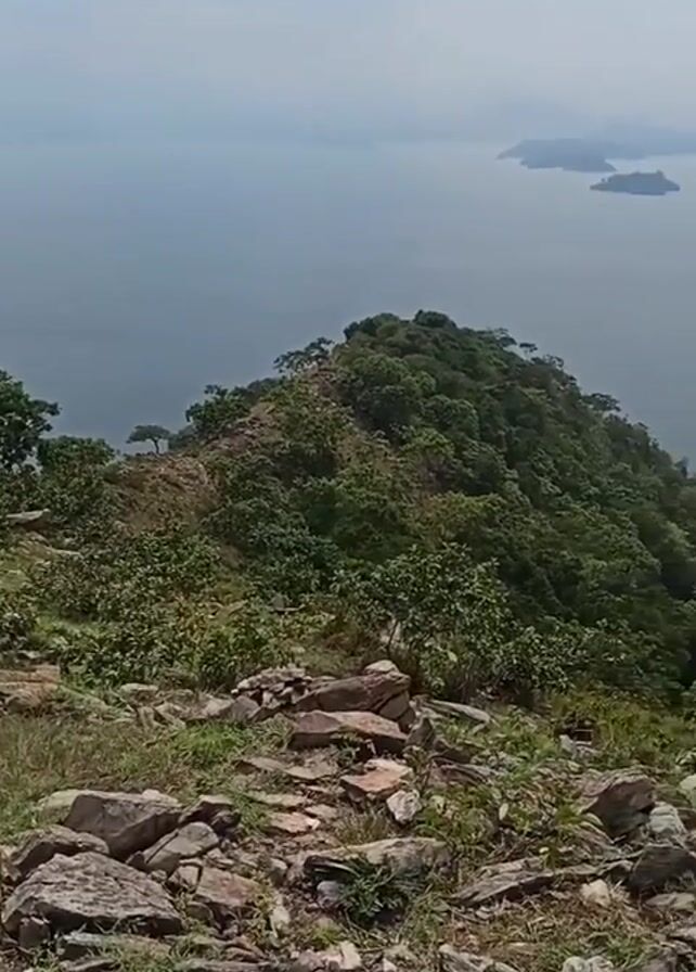 view from a rocky, grassy hillside overlooking a large body of water. The hillside is covered with green vegetation. In the distance, several small islands can be seen in the water. The sky is overcast. The camera pans slightly to the right, providing a wider view of the landscape.