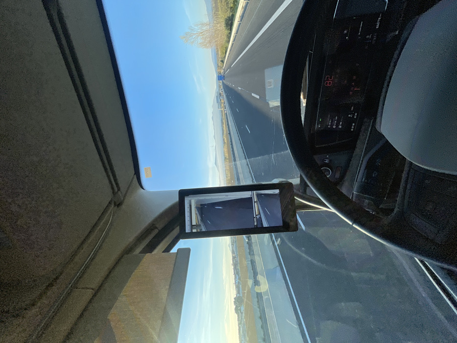 The image depicts the interior perspective from the driver's seat of a vehicle, likely a truck, traveling on a multi-lane highway in Pollestres, France. The environment is characterized by a clear blue sky and distant mountains partially obscured by a light haze on the horizon. The highway extends straight ahead, featuring asphalt pavement with distinct white lane markings and concrete barriers lining both sides. Sparse, bare deciduous trees are visible on the right side of the road, while distant structures are present on the left horizon. Inside the vehicle, a dark-colored steering wheel occupies the lower center of the frame. Below it, a digital dashboard display shows the number "82," likely indicating the vehicle's speed in kilometers per hour, alongside other operational readouts. A vertical, rectangular digital screen is mounted on the left side of the windshield, serving as a rearview mirror, displaying a perspective of the road behind or to the side, including a concrete barrier and an overhead bridge structure. The vehicle's headliner, featuring visible wiring and a sun visor, is present at the top of the frame. A yellow sticker is affixed to the upper right corner of the windshield. No individuals are visible in the frame; however, the perspective implies a driver is operating the vehicle, which is in motion on the highway. Several other vehicles, including a blue truck, are visible in the far distance on the highway.