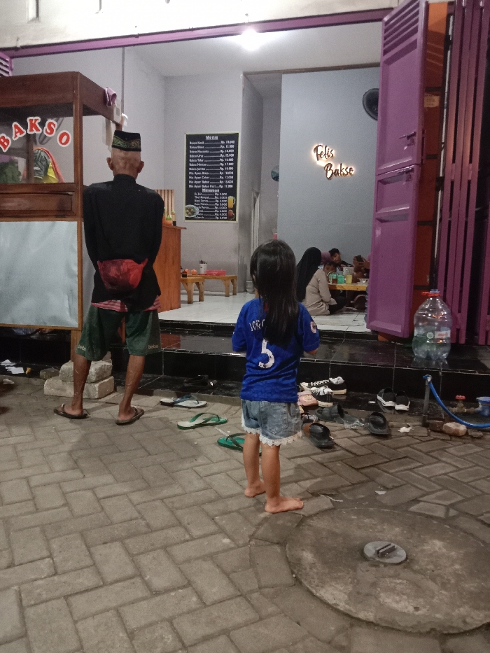 The image depicts an outdoor evening scene adjacent to a food establishment in Ketapang, Indonesia. The foreground features a grey interlocking paver surface, with a circular concrete access cover located in the bottom right. Two individuals are prominently positioned with their backs to the viewer. On the left, an adult male, bald with a dark cap, wears a black shirt, green shorts, and brown flip-flops. A red fanny pack is visible on his lower back. His left foot rests on a small concrete block. He stands facing a wooden food cart, labeled "BAKSO" in pink letters, which contains various items. To the right of the adult male, a young female child stands barefoot, wearing a blue t-shirt with a white number '5' on the back and light blue denim shorts with white lace trim. She faces the entrance of the establishment. The establishment's entrance, elevated by a step, is to the right of the food cart. Its interior walls are light grey. An illuminated sign reading "Felis Bakso" is mounted on the wall, along with a black menu board displaying items and prices in Indonesian Rupiah. A large purple bifold door or shutter is partially open on the right. Inside, multiple individuals are seated on the floor at low tables, appearing to dine or socialize; one person with a dark head covering is clearly visible. Scattered on the paved ground and the step near the entrance are numerous pairs of footwear, including various flip-flops and shoes, indicating patrons have removed them prior to entering. A large clear plastic water bottle stands on the paved surface near the purple door, connected by a blue hose to a spigot on the building's exterior. The scene is illuminated by artificial light sources from within the establishment, contrasting with the dark ambient night environment.