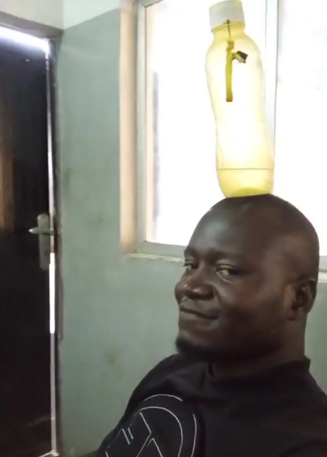 A man with dark skin and a shaved head is shown from the chest up, sitting in what appears to be an indoor room. He wears a black shirt with a white circular design. He smiles and looks at the camera. On top of his head, he is balancing a yellow water bottle, which is slightly translucent and partially filled with liquid. Behind him, there is a window with a white frame and light filtering through. The walls are painted in a muted grey-green. The lighting appears to be bright and somewhat diffuse, possibly from the window.