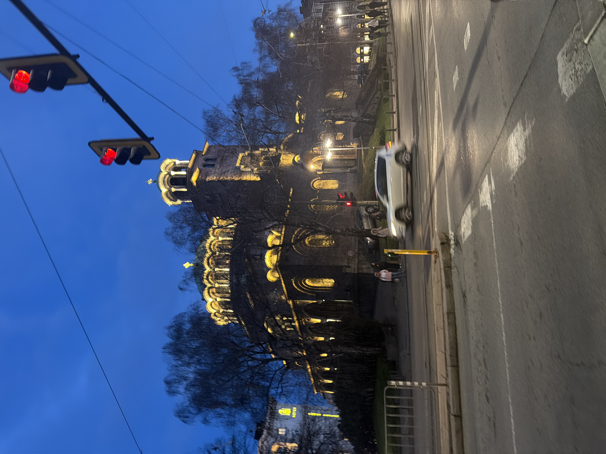street view at night in Sofia, Bulgaria. The Alexander Nevsky Cathedral is prominently visible, illuminated with warm light. A white car is moving along the street, and pedestrians are present on the sidewalk. Traffic lights show a red signal. The sky is a deep blue. The street is paved, and there is a metal fence along the sidewalk. Trees with bare branches are scattered around the cathedral. A building with lit windows is visible in the background.